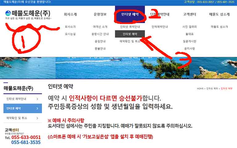 매물도해운 홈페이지로 들어가서 상단의 인터넷 예약 -> 인터넷 예약 버튼을 누르면 인터넷 예약신청이 가능하다.